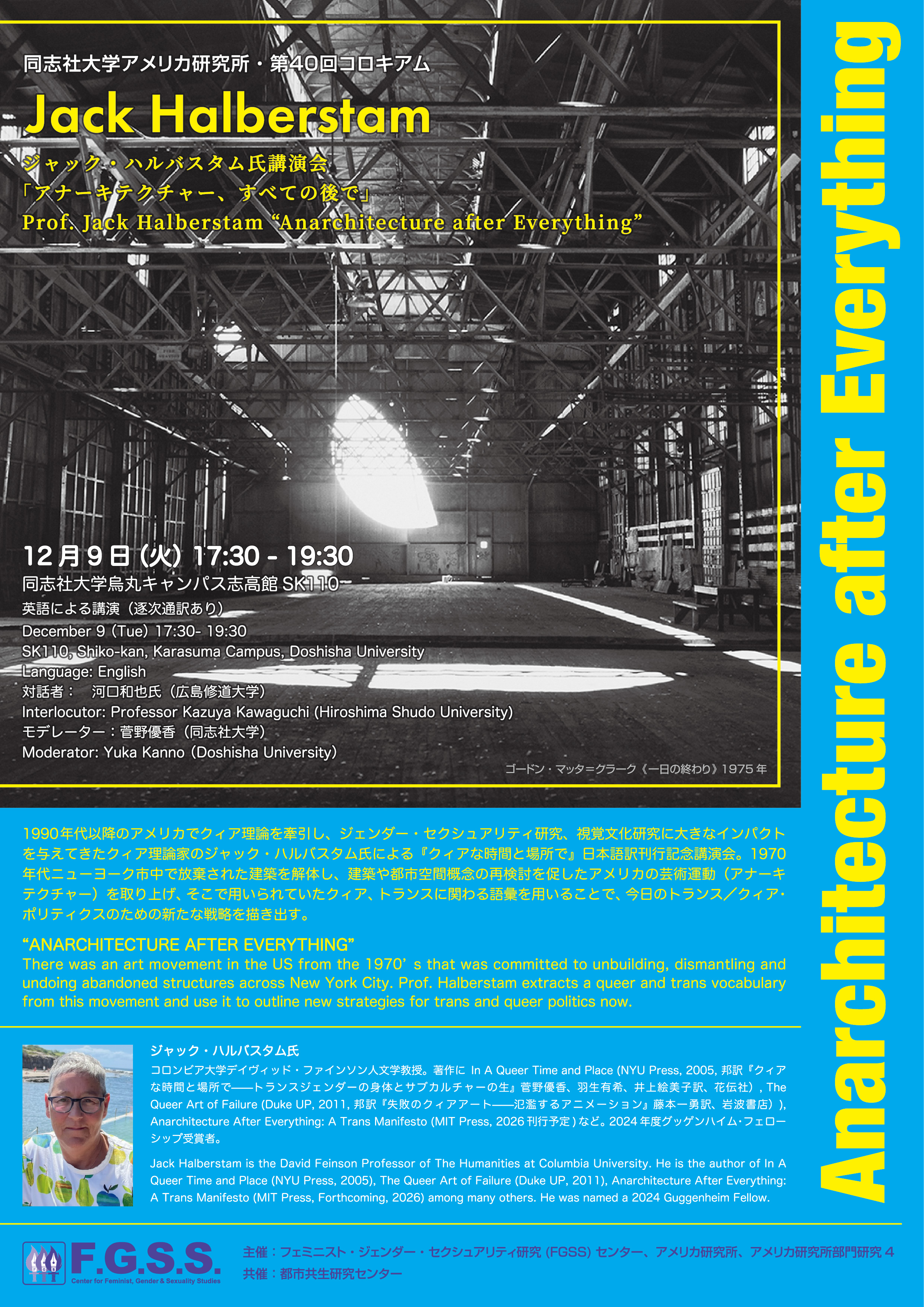 1990年代以降のアメリカでクィア理論を牽引し、ジェンダー・セクシュアリティ研究、視覚文化研究に大きなインパクトを与えてきたクィア理論家のジャック・ハルバスタム氏による『クィアな時間と場所で』日本語訳刊行記念講演会。1970年代ニューヨーク市中で放棄された建築を解体し、建築や都市空間概念の再検討を促したアメリカの芸術運動(アナーキテクチャー)を取り上げ、そこで用いられていたクィア、トランスに関わる語彙を用いることで、今日のトランス/クィア・ポリティクスのための新たな戦略を描き出す。